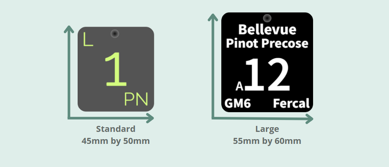 We offer two standard tag sizes: 45mm x 50mm for Standard and 50mm x 55mm for Large. The 45mm x 50mm tag fits standard information such as row number, grape variety, and a little more. The larger 50mm x 55mm tag offers more flexibility, with room for all the same details plus additional space for rootstock, custom logos, and more. Custom sizes are also available, ranging from a minimum of 50mm² up to 220mm².